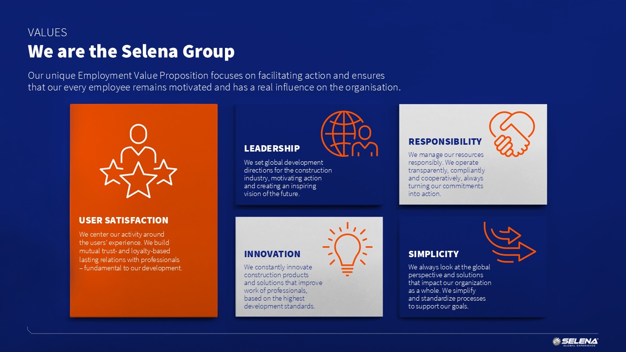 Selena Group is a global leader and distributor of construction chemicals and one of the four largest producers of polyurethane foam in the world. Selena was founded in 1992 in Wrocław. At present close to 2.000 employees around the world work for Selena Group. The Group’s product range includes foams, sealants, adhesives, waterproofing products, insulation systems, fastenings and complementary products. The Group comprises 35 companies in 18 countries. The Group’s manufacturing plants are located in Poland, South Korea, China, Romania, Turkey, Spain, Kazakhstan and Italy.